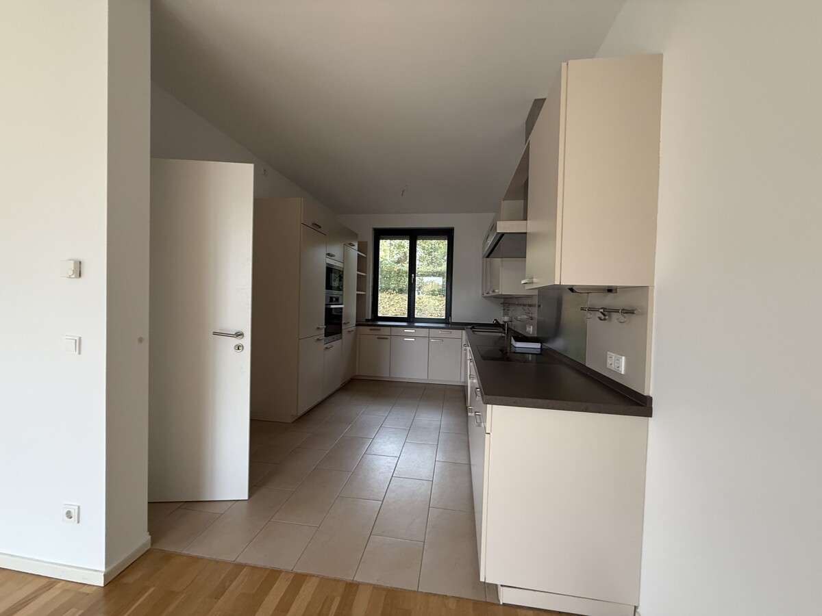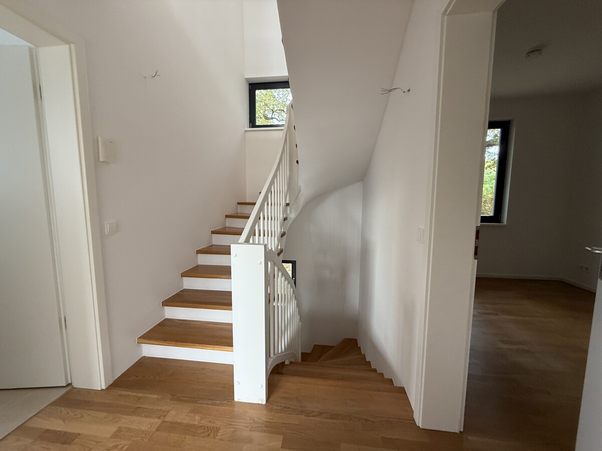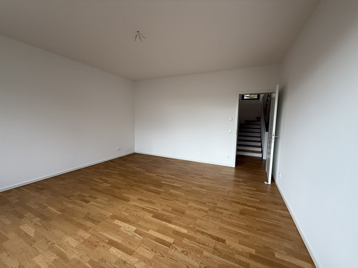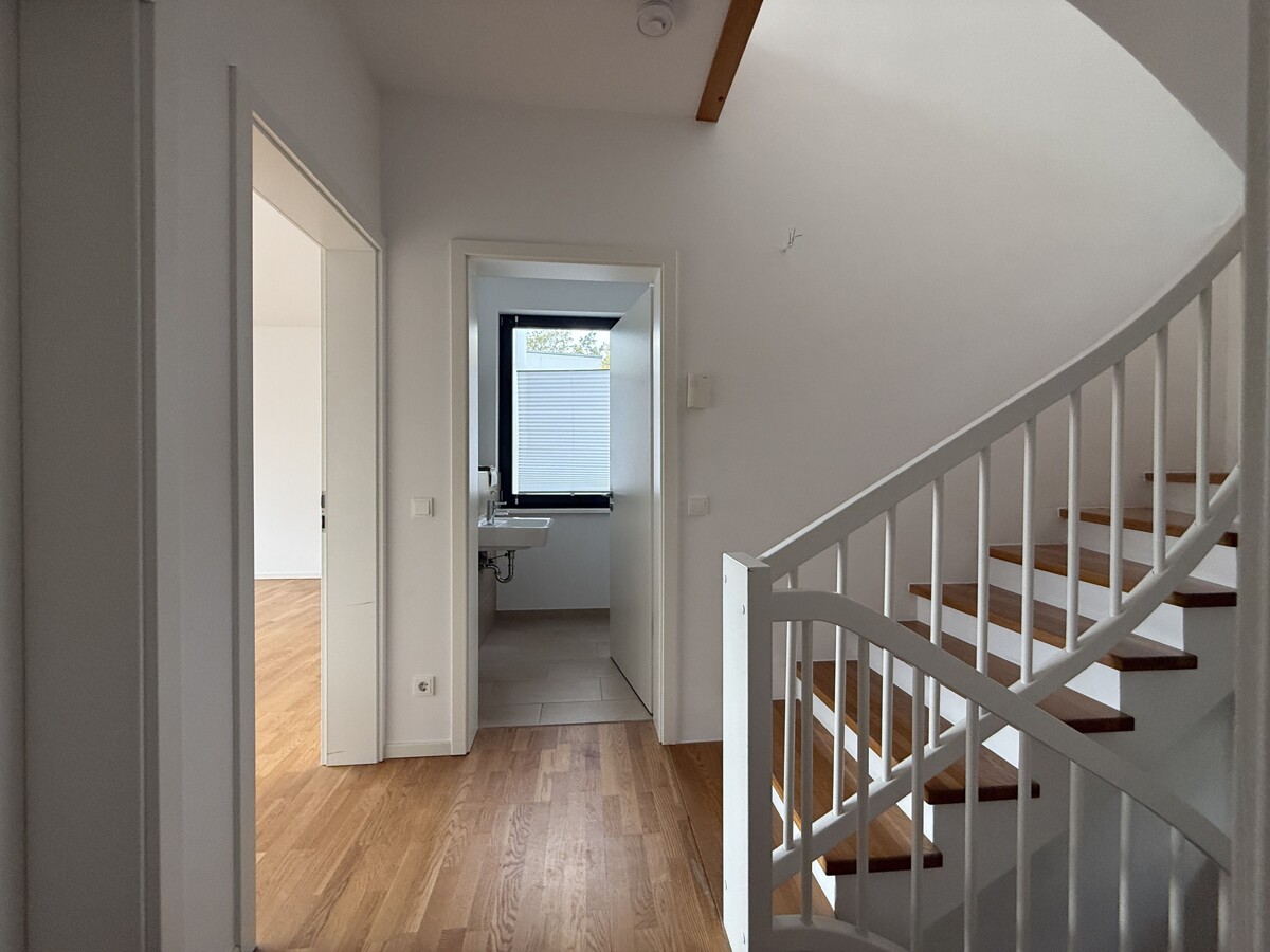 Im Erdgeschoss befindet sich der helle und offen gestaltete Wohn- und Essbereich mit direktem Zugang zur Terrasse und zum eigenen Garten. Die angrenzende Küche ist funktional geschnitten und mit einer EBK inkl. E-Geräten ausgestattet, die dem Mieter zur Nutzung zur Verfügung steht. Ergänzt wird das Erdgeschoss durch einen Eingangsbereich mit Garderobe sowie ein Gäste-WC.