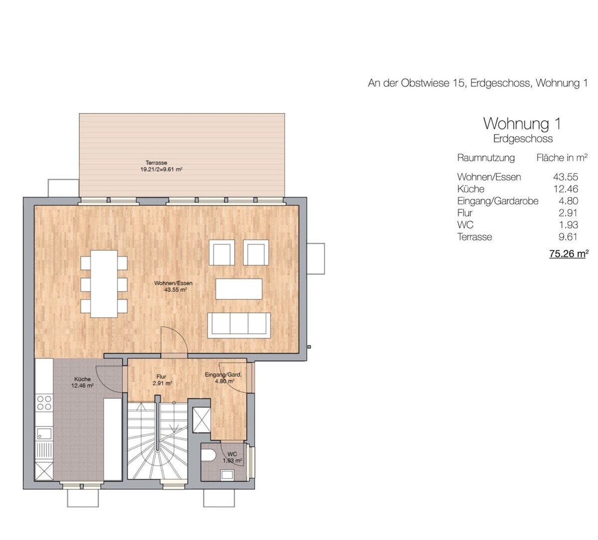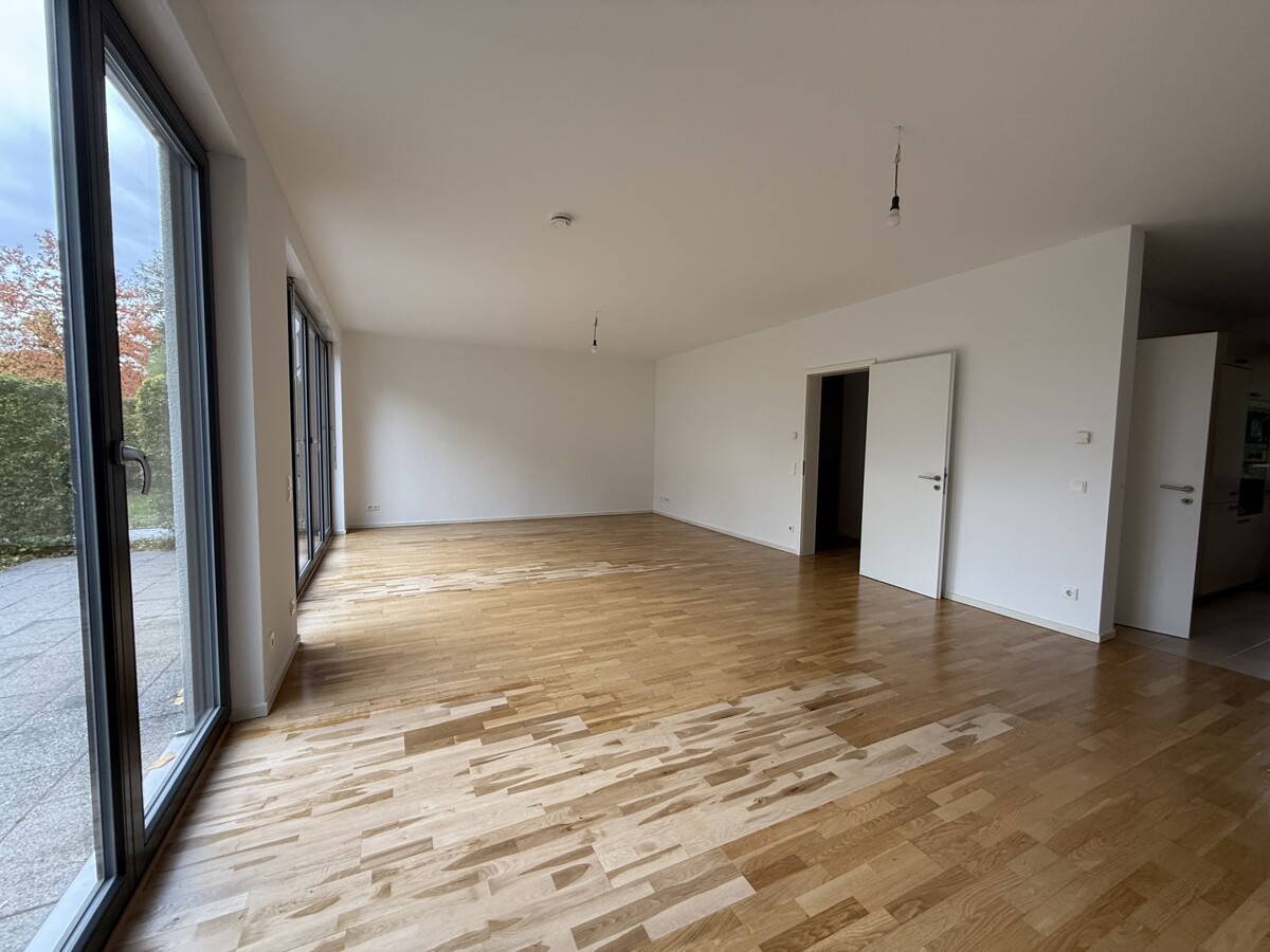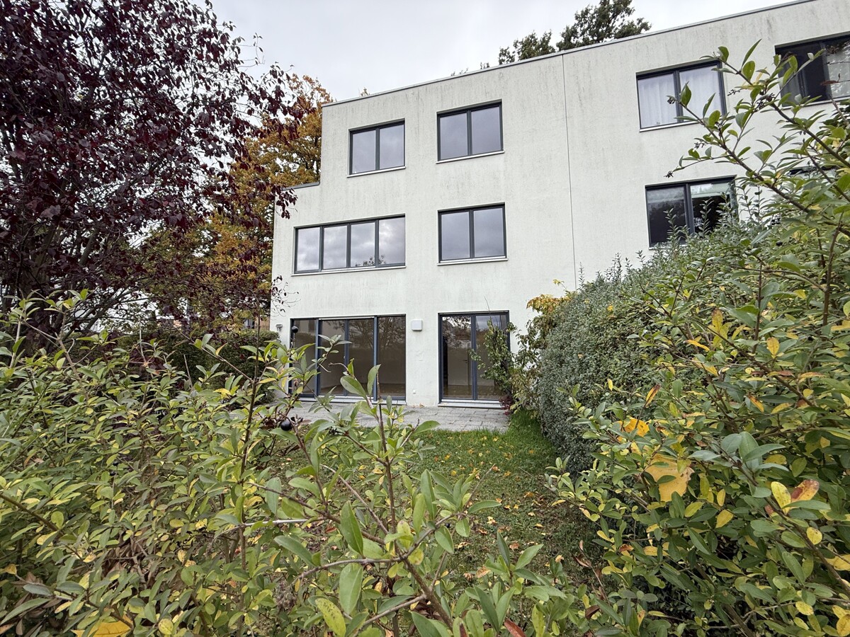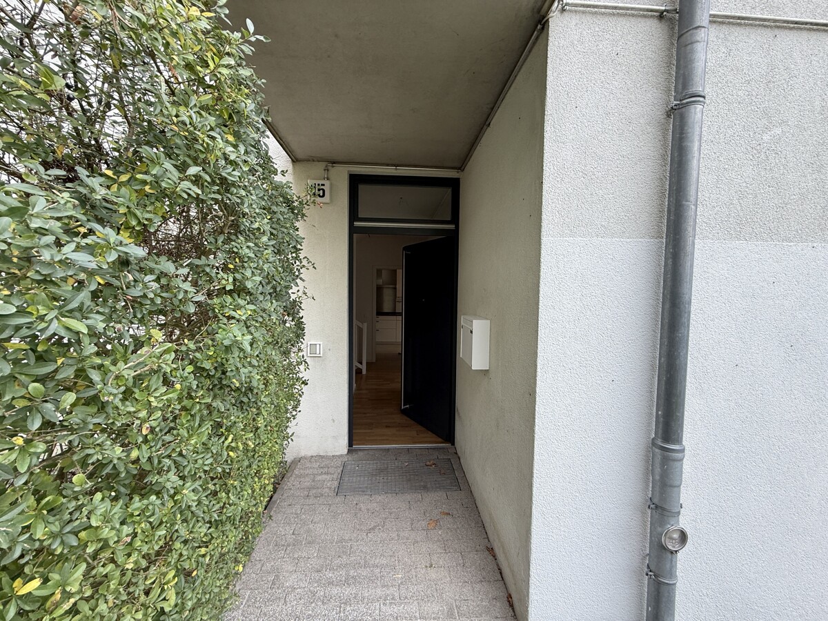 Im Erdgeschoss befindet sich der helle und offen gestaltete Wohn- und Essbereich mit direktem Zugang zur Terrasse und zum eigenen Garten. Die angrenzende Küche ist funktional geschnitten und mit einer EBK inkl. E-Geräten ausgestattet, die dem Mieter zur Nutzung zur Verfügung steht. Ergänzt wird das Erdgeschoss durch einen Eingangsbereich mit Garderobe sowie ein Gäste-WC.