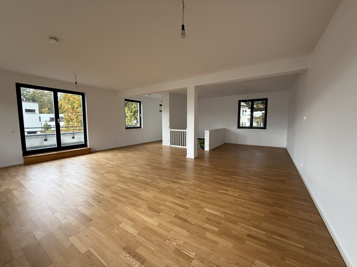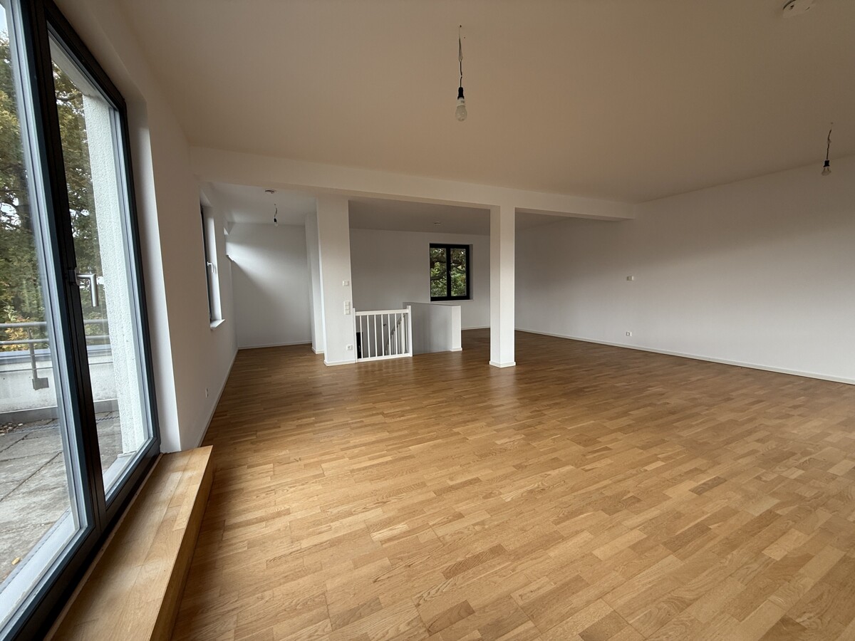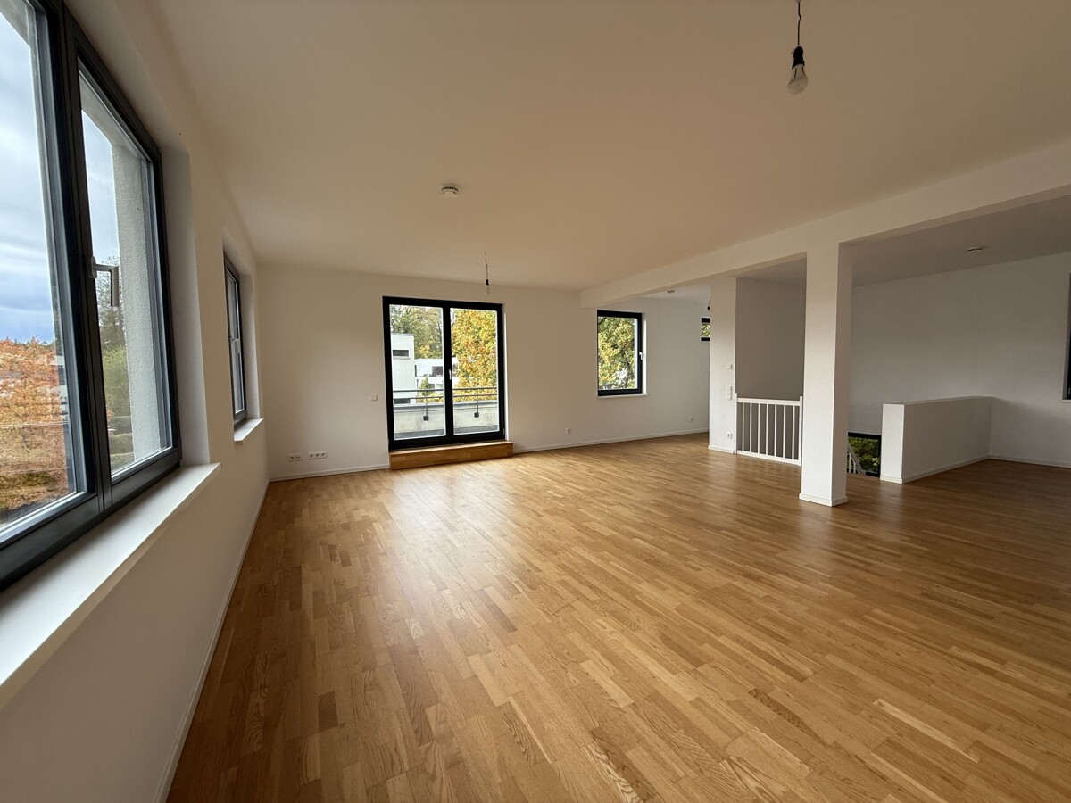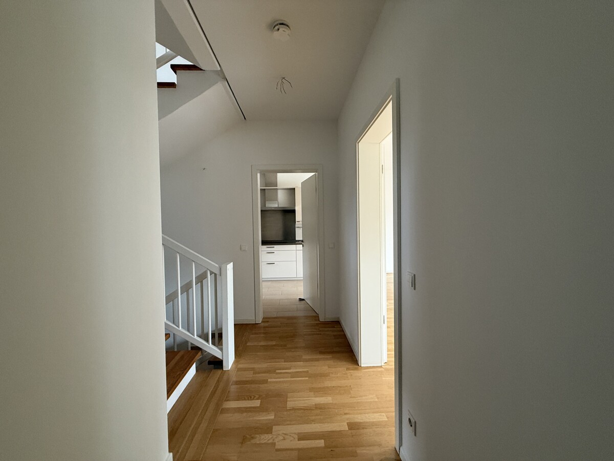 Das Dachgeschoss ist als großzügiges Studio ausgebaut und bietet vielfältige Nutzungsmöglichkeiten – beispielsweise als Büro, Gästezimmer oder Rückzugsort. Von hier aus gelangen sie auf die Dachterrasse, die zusätzlichen Freiraum im Sommer schafft.