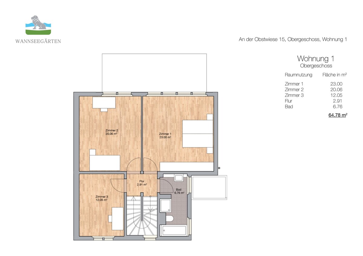 Das Obergeschoss verfügt über drei gut geschnittene Zimmer, die sich als Schlaf-, Kinder- oder Arbeitszimmer eignen. Das moderne Tageslichtbad ist mit einer Badewanne und Dusche ausgestattet.