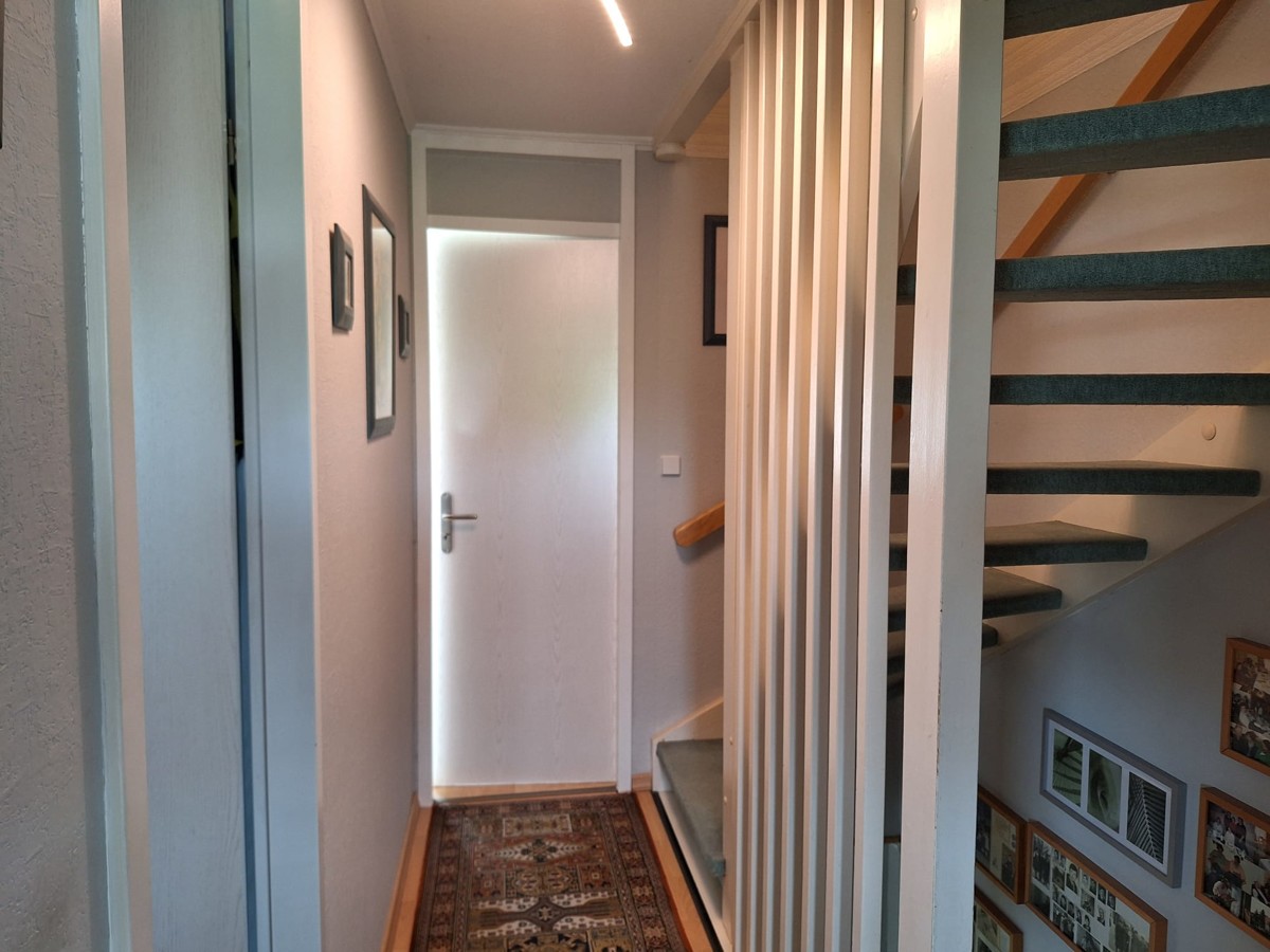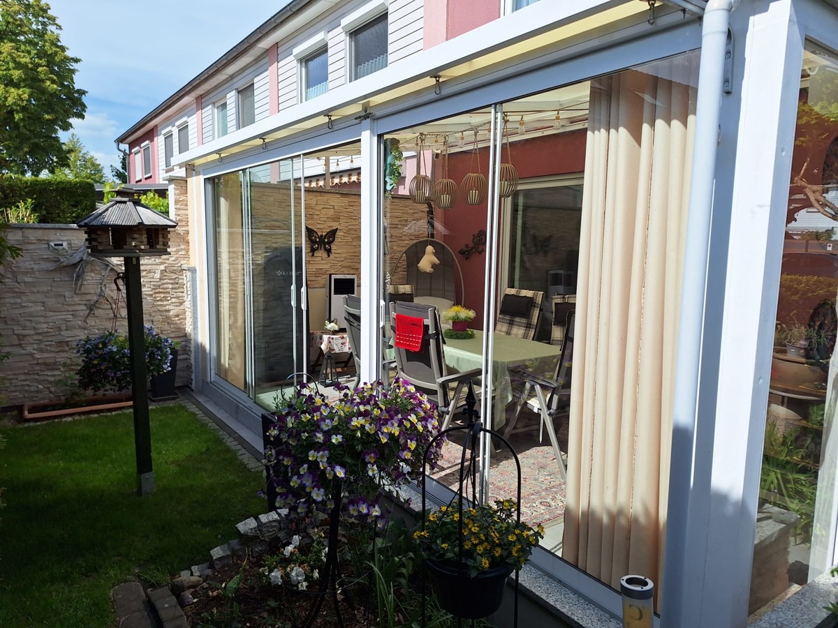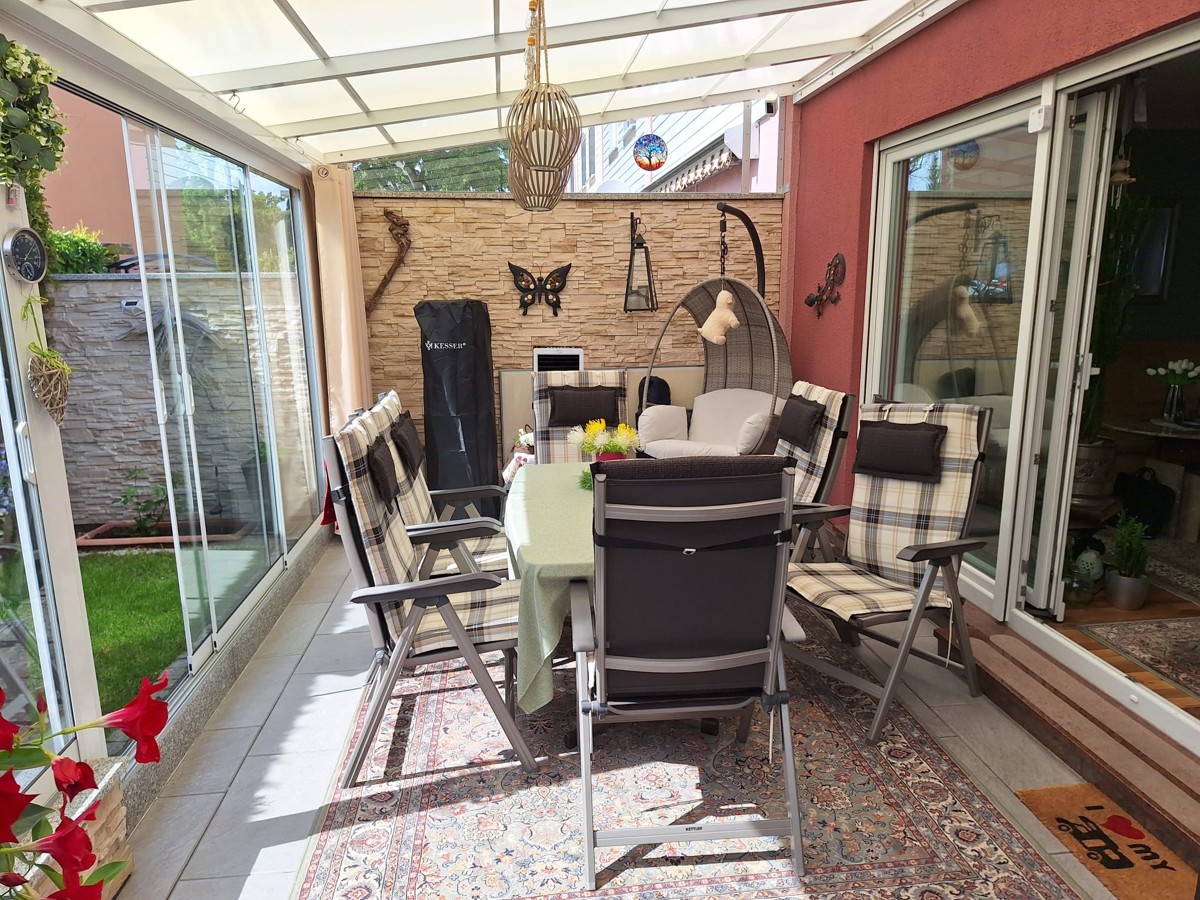 Zum unterkellerten Reiheneckhaus, Bj. 1997, gehört ein pflegeleicht angelegter Gartenanteil von ca. 167m² (Sondernutzungsrecht). Im EG befinden sich das Gäste WC, die offene Küche und ein ca. 30 m² großer Wohn- und Essbereich. Die EBK, mit Ausnahme der elektrischen Geräte, verbleibt im Haus. Durch die Glasüberdachung der Terrasse mit ca. 3×5 m und den Einbau von Glasschiebeelementen, kann die Terrasse viele Monate genutzt werden. Optisch wird damit auch eine Vergrößerung des Wohnbereichs erreicht. Die Terrassenfläche von ca. 15m² ist in der Wohnflächenangabe nicht mit enthalten.