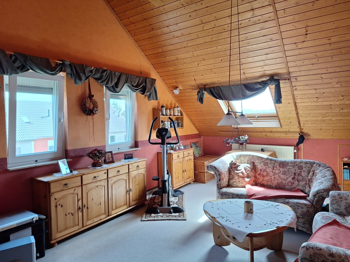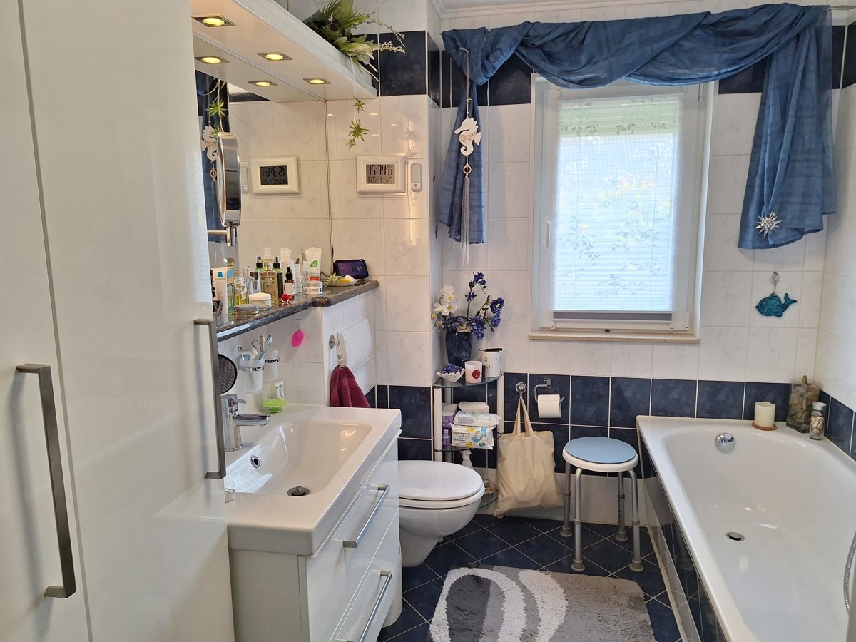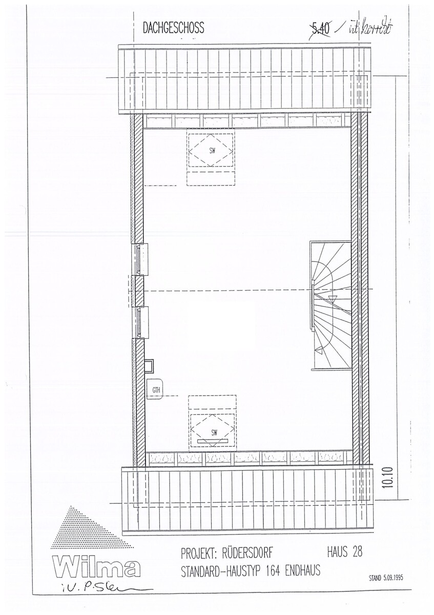 Im OG befinden sich zwei weitere Zimmer und das Badezimmer mit Wanne und Dusche. Die Trennwand, der beiden auf der Grundrißzeichnung angegebenen Kinderzimmer, wurde beseitigt und der Raum als ein Zimmer genutzt. Ein Rückbau der Trennwand ist problemlos möglich. Über eine Treppe ist das DG, das zu einem Studio mit ca. 22 m² Wfl. ausgebaut wurde, zu erreichen. Hier befindet sich auch die 2021 neu installierte Junkers-Gaszentralheizung.