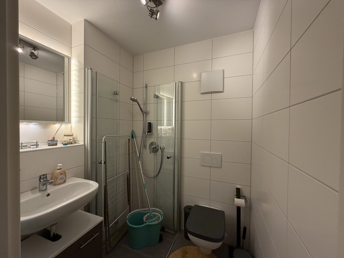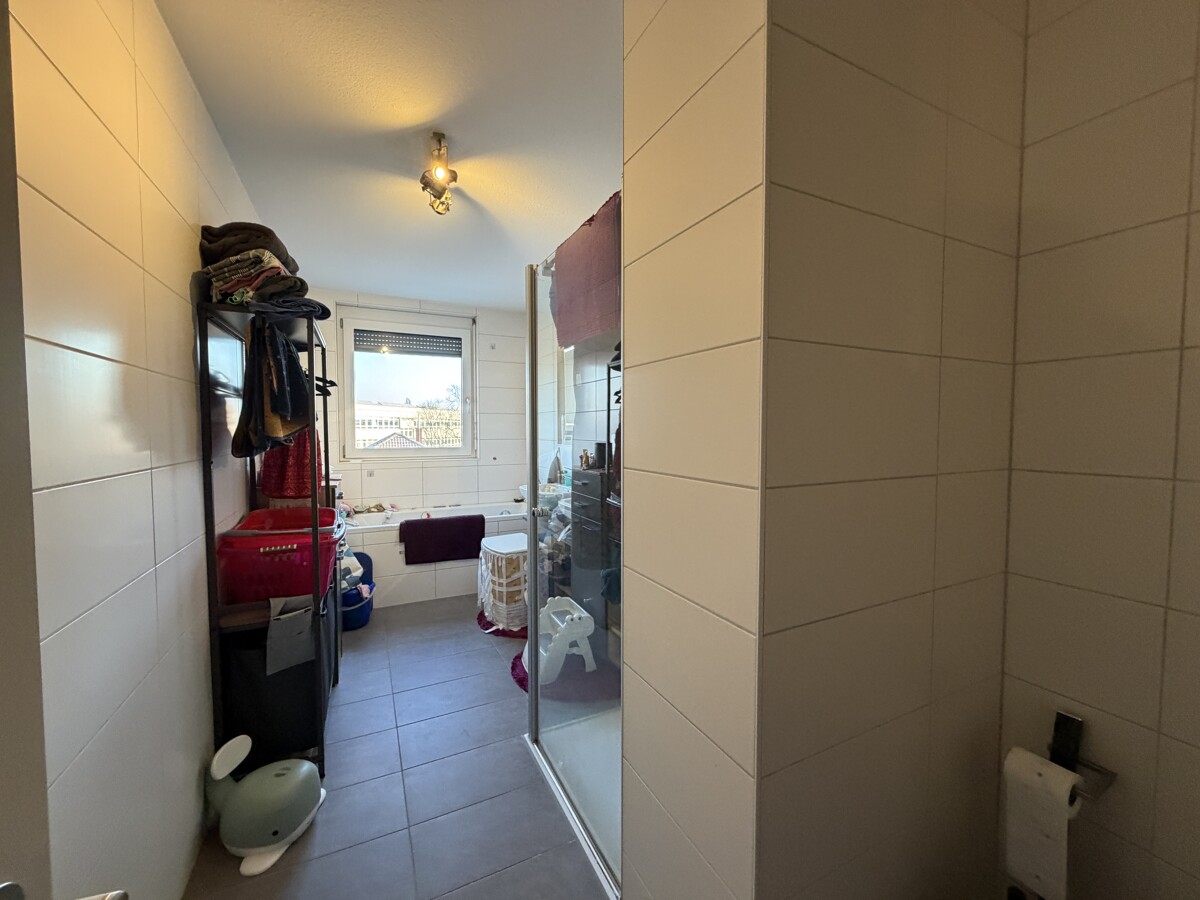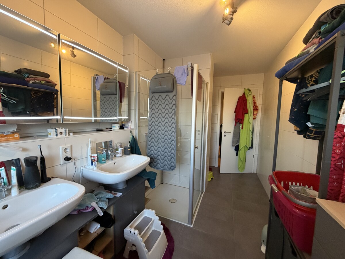 Das Tageslichtbad ist hochwertig ausgestattet und verfügt über eine bodengleiche Dusche, eine Badewanne, zwei Waschbecken sowie ein Hänge-WC. Das separate Gäste-WC ist ebenfalls mit einer Dusche ausgestattet und bietet zusätzlichen Komfort. Die vorhandene Einbauküche kann gegen eine Abstandszahlung vom derzeitigen Mieter übernommen werden (ohne Elektrogeräte).