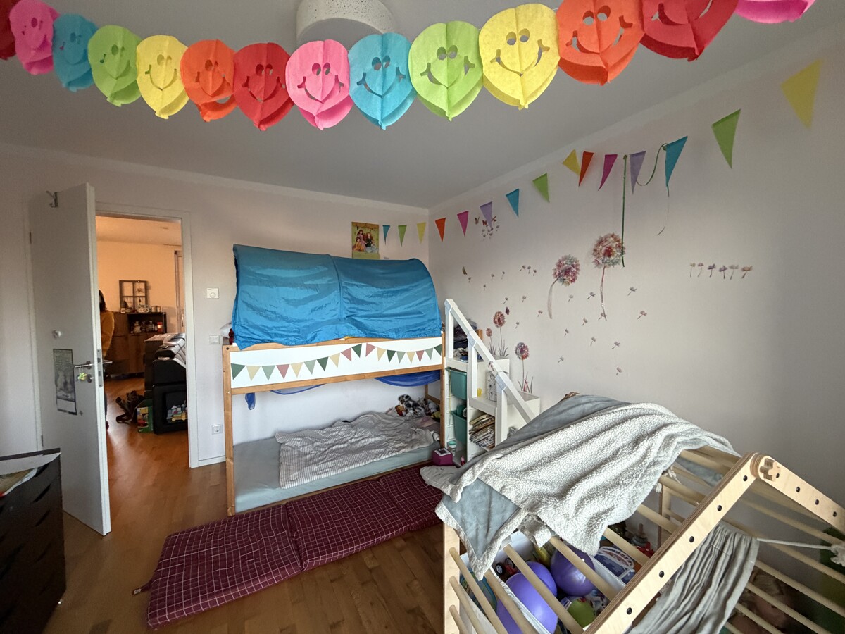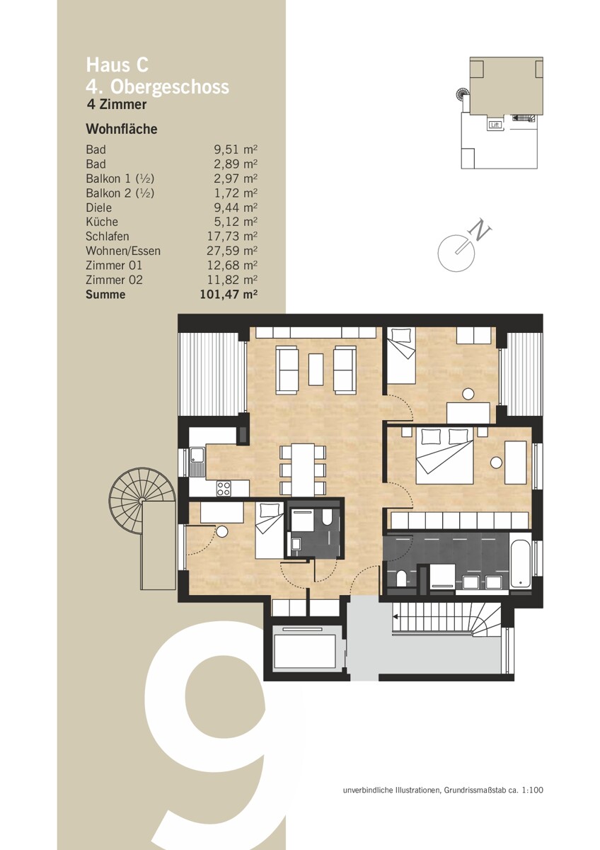 Die großzügige 4-Zimmer-Wohnung liegt im Haus 1 (vordere Bebauung) in der 4. Etage und ist bequem mit dem Fahrstuhl erreichbar. Der durchdachte Grundriss umfasst einen zentralen Flur, ein großzügiges Wohnzimmer mit ca. 27 m² und offener Küche, ein helles Schlafzimmer mit ca. 17 m² sowie zwei Kinderzimmer mit ca. 11 m² und 12 m². Ergänzt wird das Raumangebot durch ein modernes Tageslichtbad sowie ein separates Gäste-WC.