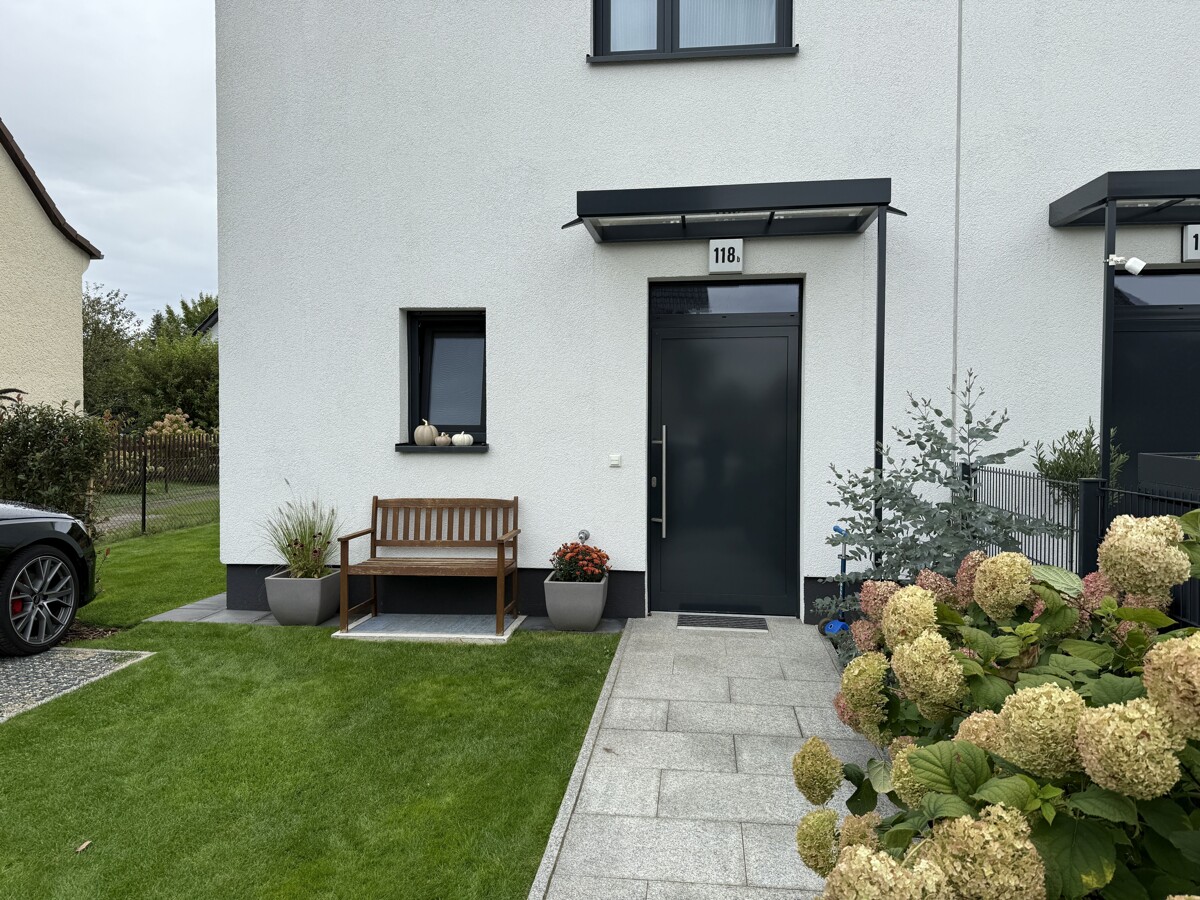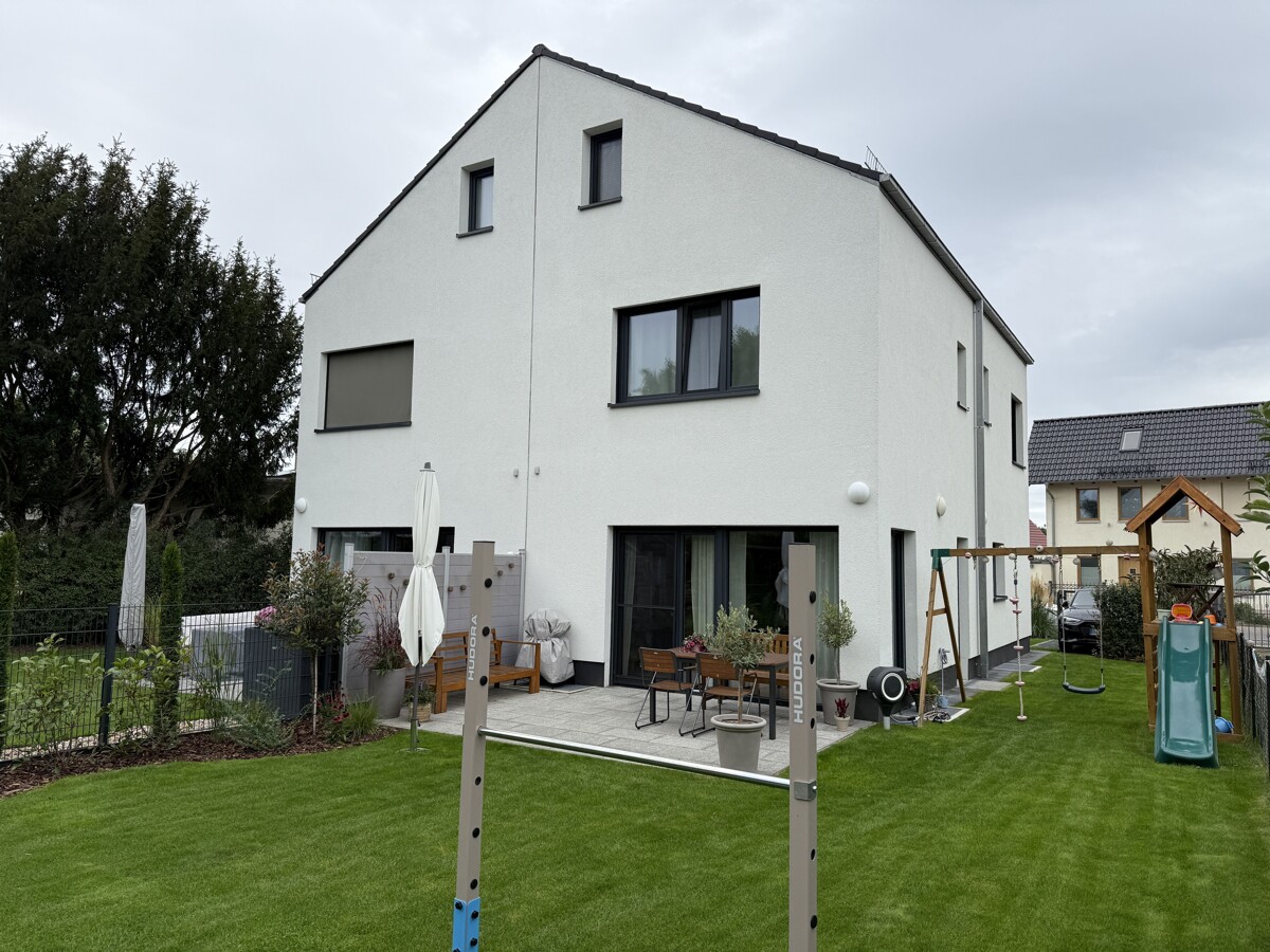 Das moderne, unterkellerte Doppelhaus mit Satteldach wurde im Jahr 2021 errichtet und befindet sich in einem sehr gepflegten und neuwertigen Zustand. Das Gebäude ist mittig in zwei Haushälften geteilt.