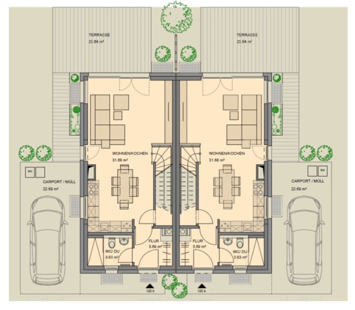 Die Wohnfläche beträgt ca. 106 m², während das Grundstück eine Größe von rund 160 m² aufweist. Vor dem Haus befindet sich zudem ein eigener Kfz-Stellplatz, der sich direkt auf dem Grundstück befindet.