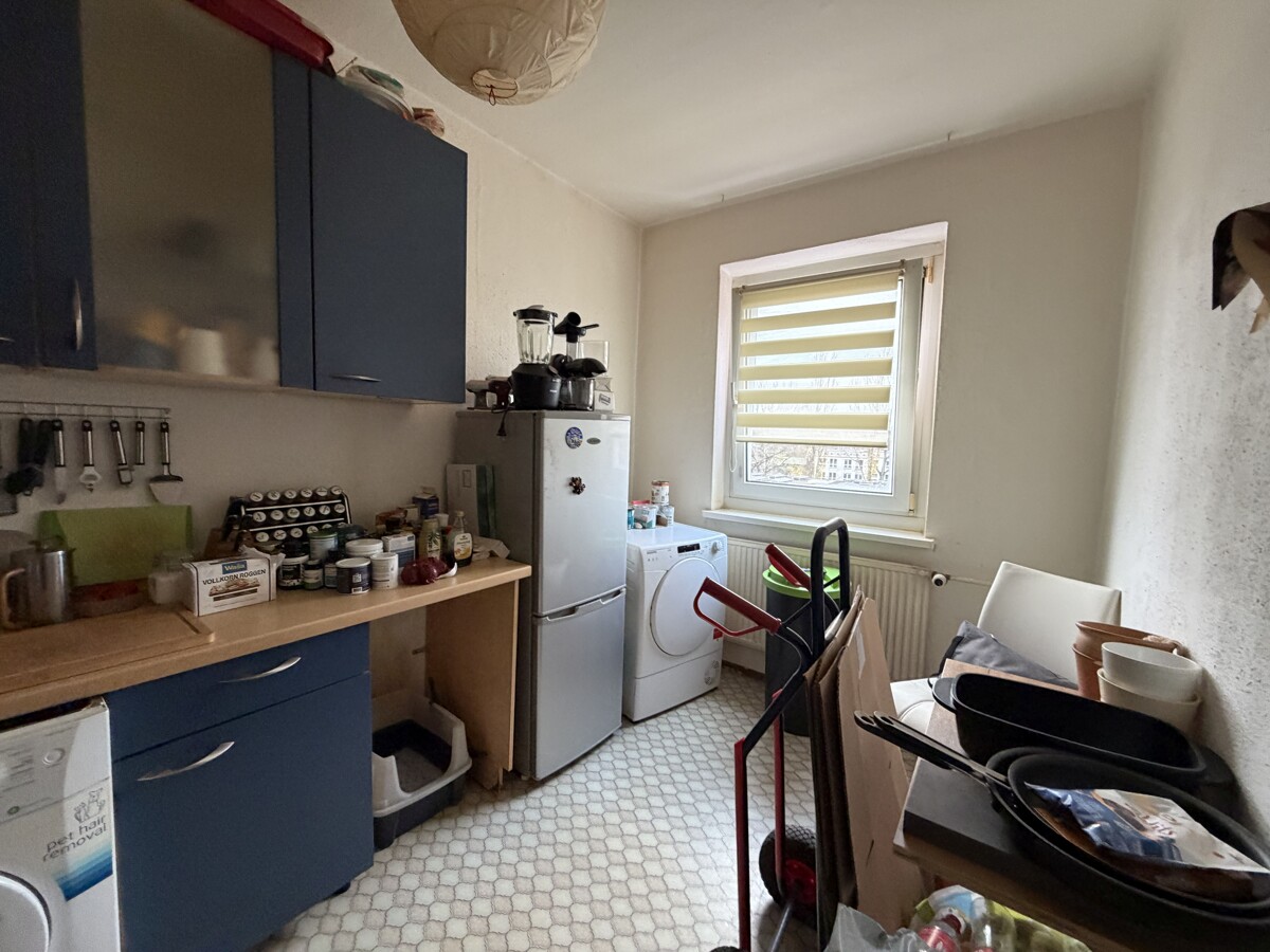 Die Wohnung befindet sind in der 3. Etage (ohne Aufzug). Der Grundriss besteht aus einem zentralen Flur, von dem das geräumige Wohnzimmer (ca. 16m²) mit Zugang zur Küche, das Schlafzimmer (ca. 16m²) sowie das Badezimmer abgehen. Das Schlafzimmer liegt ruhig zum Hof hinaus. Das innenliegende Badezimmer ist mit einer Badewanne, einem WC sowie einem Handwaschbecken ausgestattet, weiterhin befindet sich hier der Anschluss für eine Waschmaschine. Im Flurbereich befindet sich eine Abstellnische, die weiteren Stauraum bietet. In der gesamten Wohnung liegt PVC-Belag.