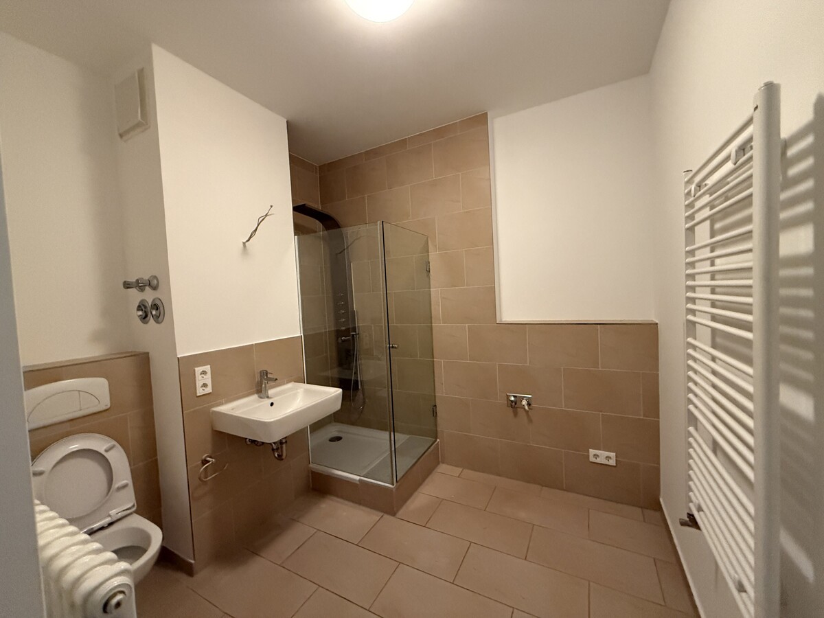 Das modern geflieste Badezimmer verfügt über eine Dusche, ein Hänge-WC, ein Handwaschbecken sowie einen Anschluss für eine Waschmaschine.